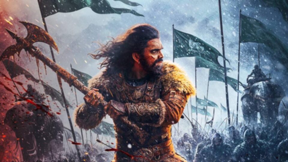 The first-look poster is a striking visual set against a storm-lashed, snow-covered battlefield. Rishabh appears in mid-charge, brandishing a giant, blood-soaked battle axe with fierce resolve.